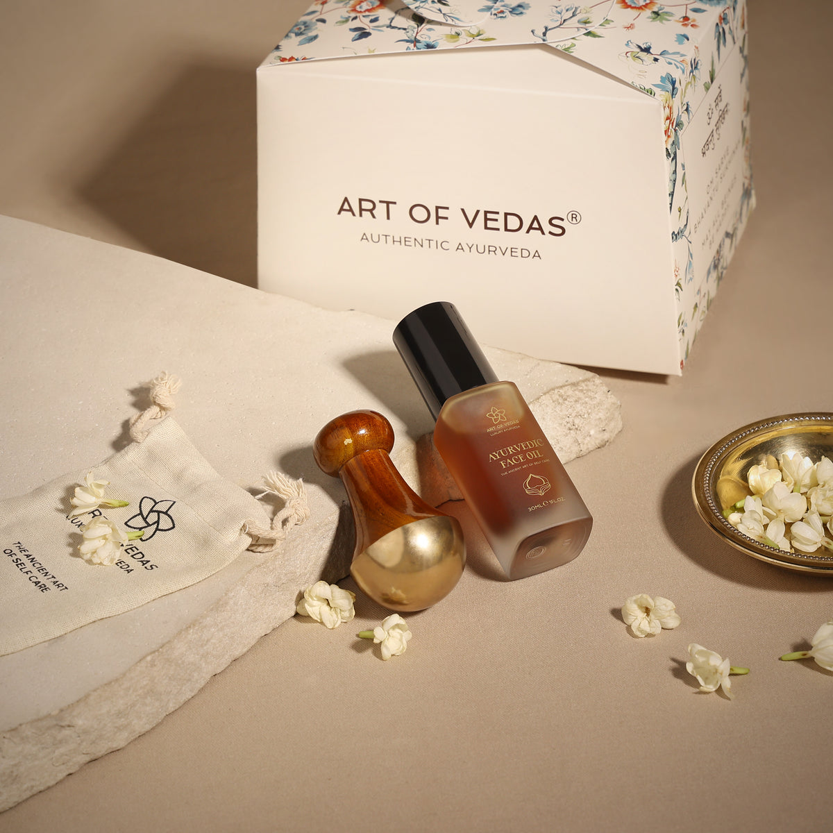 Start by applying a few drops of the Ayurvedic Face Oil to clean, dry skin. Gently massage it into your face and neck in upward, circular motions. This step provides deep nourishment, preparing your skin for optimal absorption in the next steps.