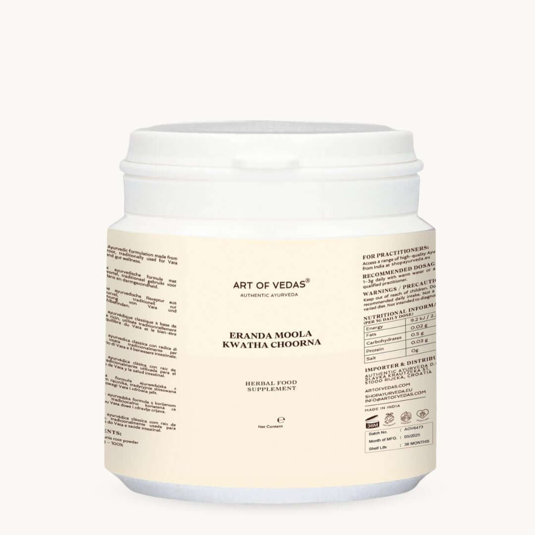 Eranda Moola Kwath Choornam est une poudre de décoction ayurvédique classique préparée à partir de la racine de Ricinus communis (plante de ricin). Elle est traditionnellement utilisée pour apaiser le Vata dosha aggravé, en particulier dans les membres inférieurs, le bassin et la colonne vertébrale. Connue pour ses propriétés à action profonde, elle est couramment prescrite dans les affections liées à Vata et les thérapies Panchakarma.