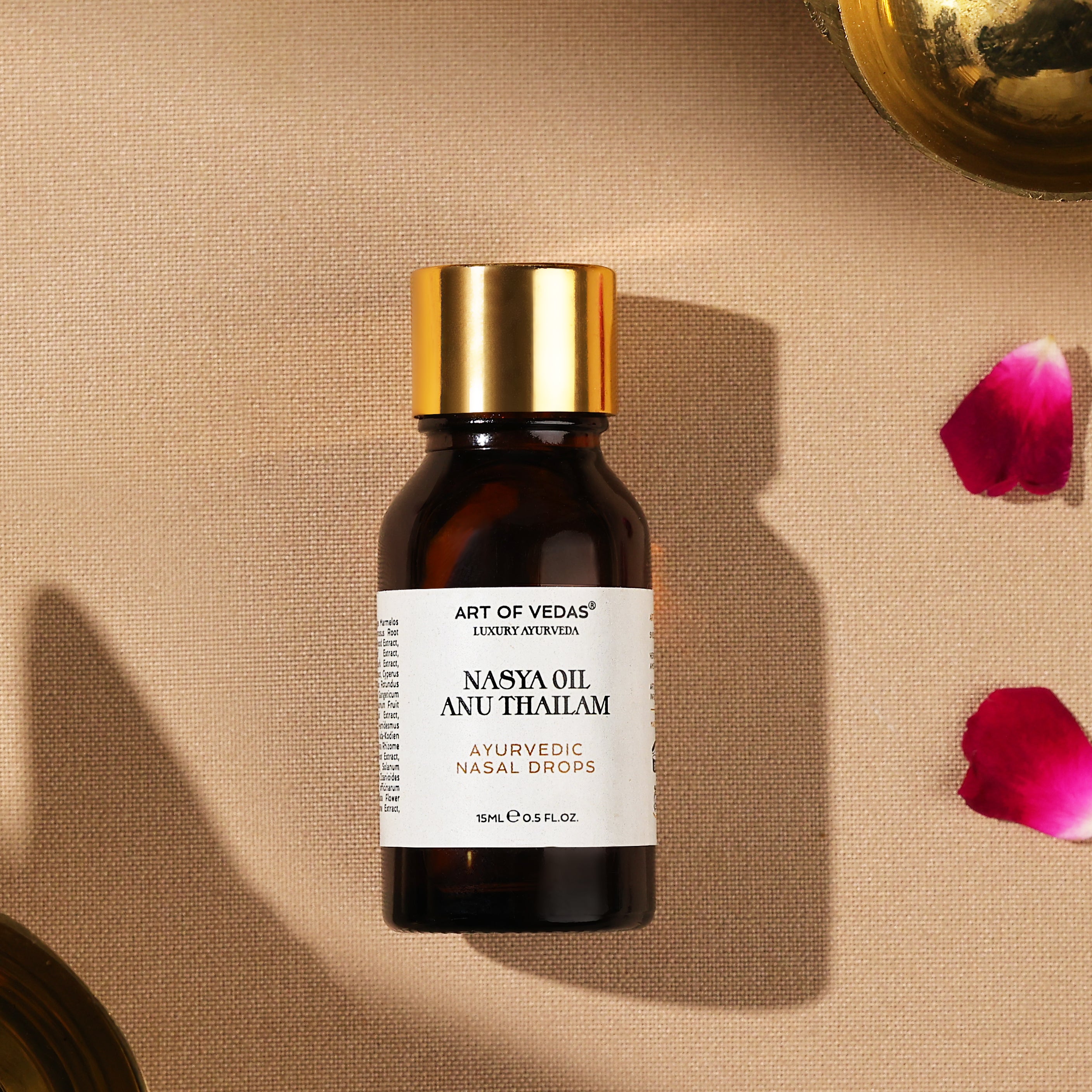 Art of Vedas prepares Anu Thailam according to the classical formulation from Ashtanga Hridaya, 24 herbs processed in pure sesame oil using traditional methods.